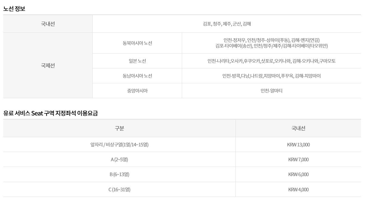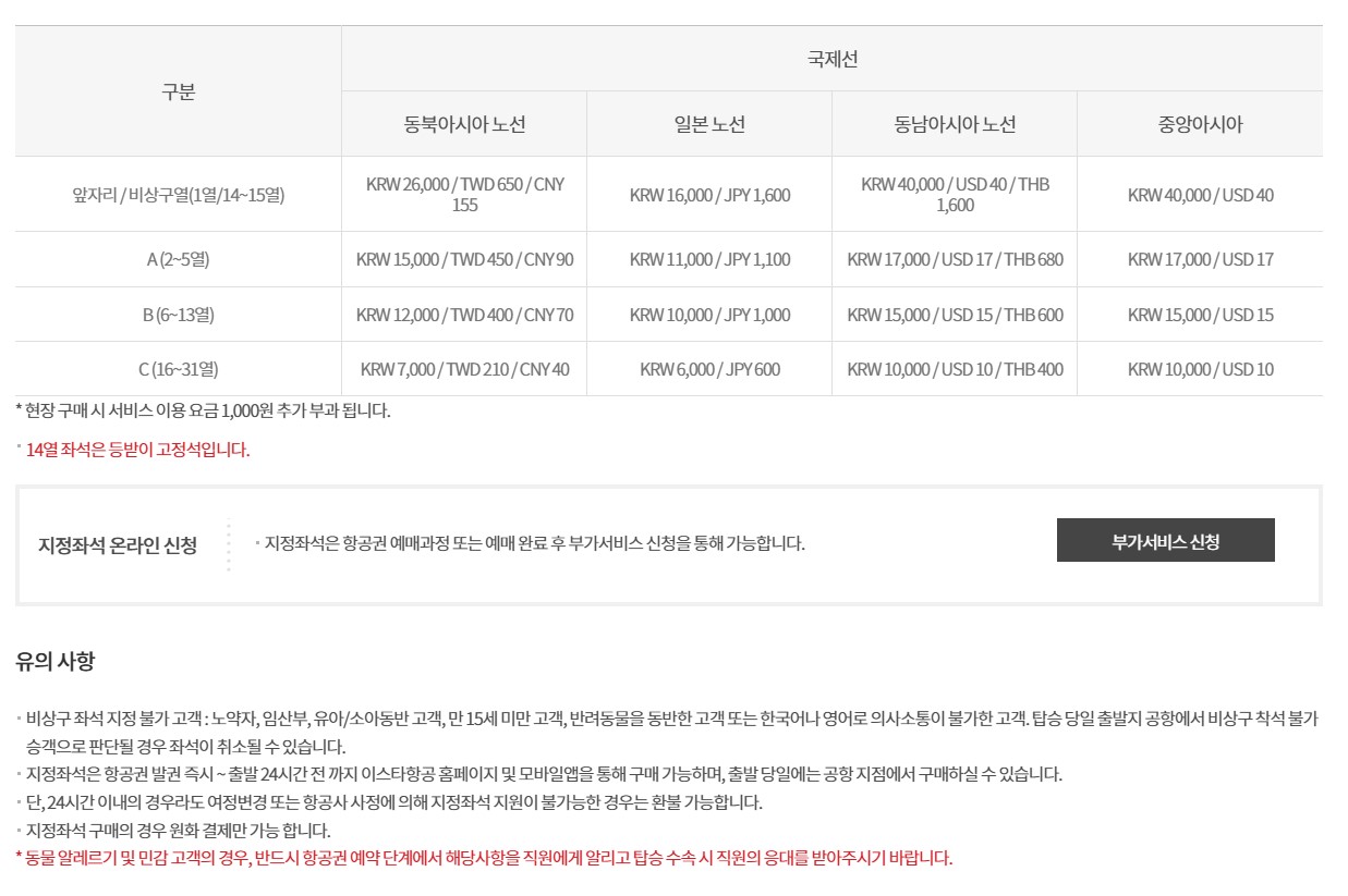 3.이스타 항공 노선 정보 및 지정 좌석 이용 요금